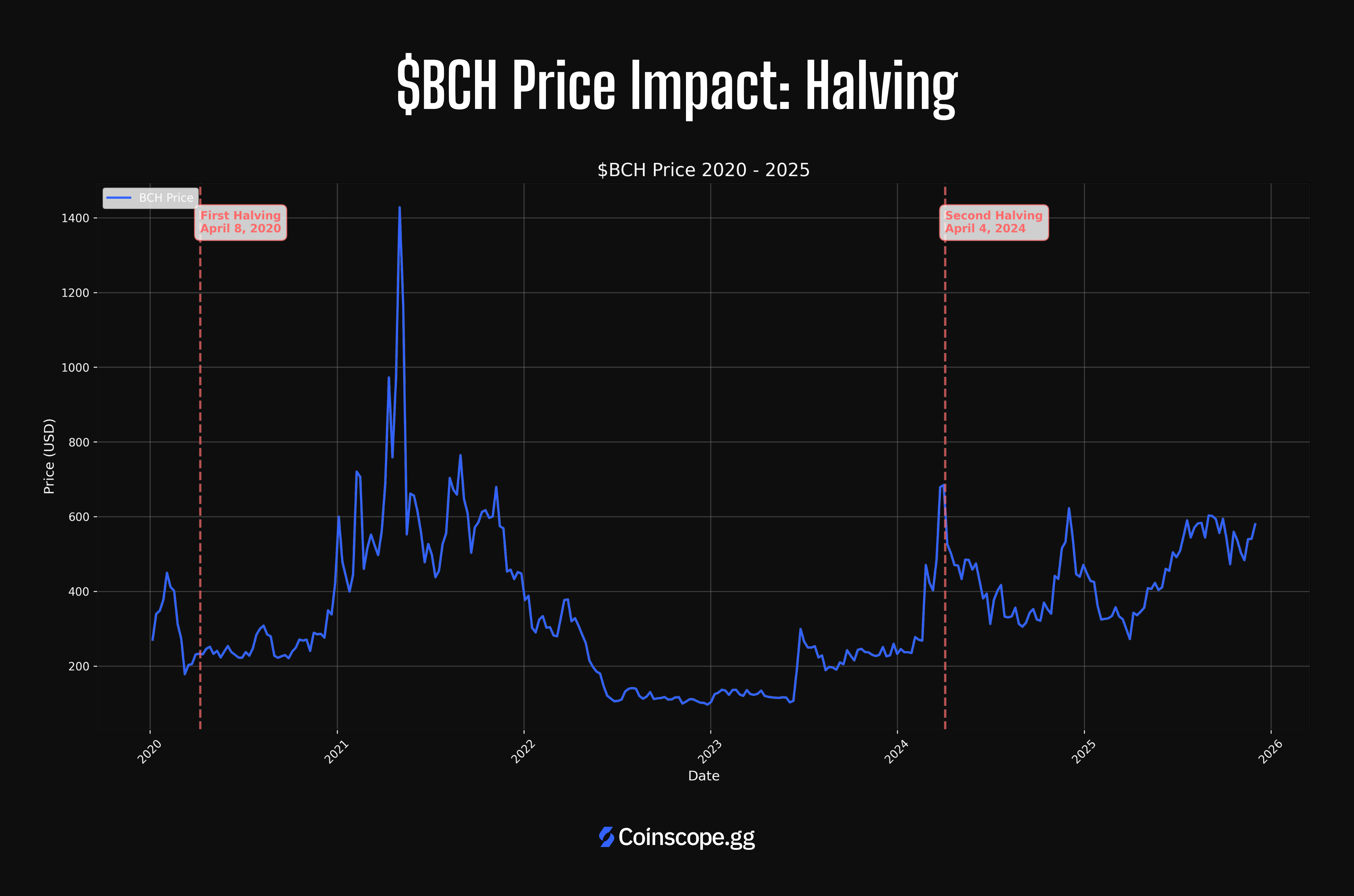 - First halving (April 8, 2020): in the ~3 months leading up, BCH saw a sizable percentage rise; around the event itself, price action was volatile and largely faded afterward.