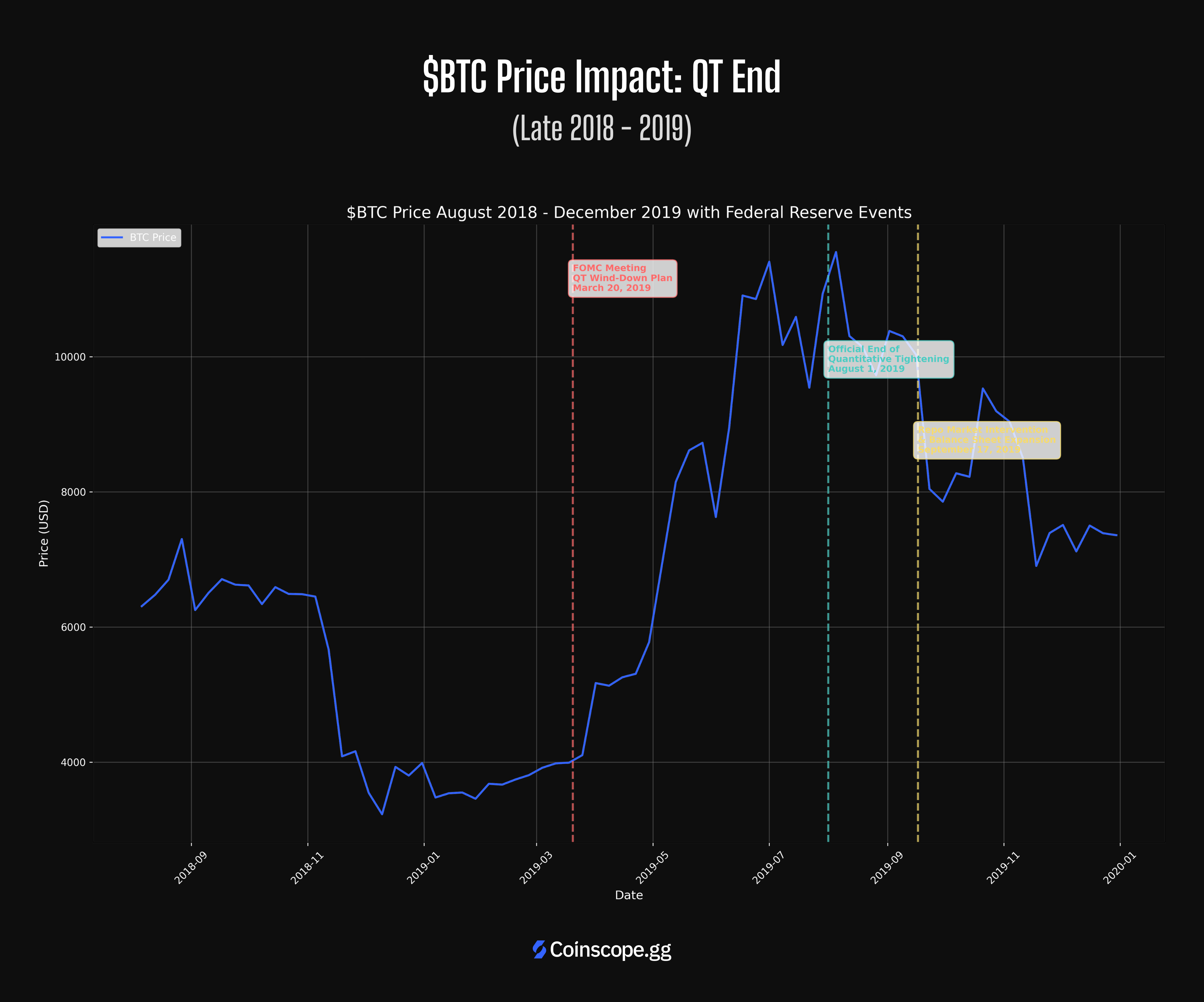 In late 2018-2019: BTC put in a major bottom in the low 3k area as the "QT is ending" narrative built up, it repriced into the 12-13k zone within a few months.